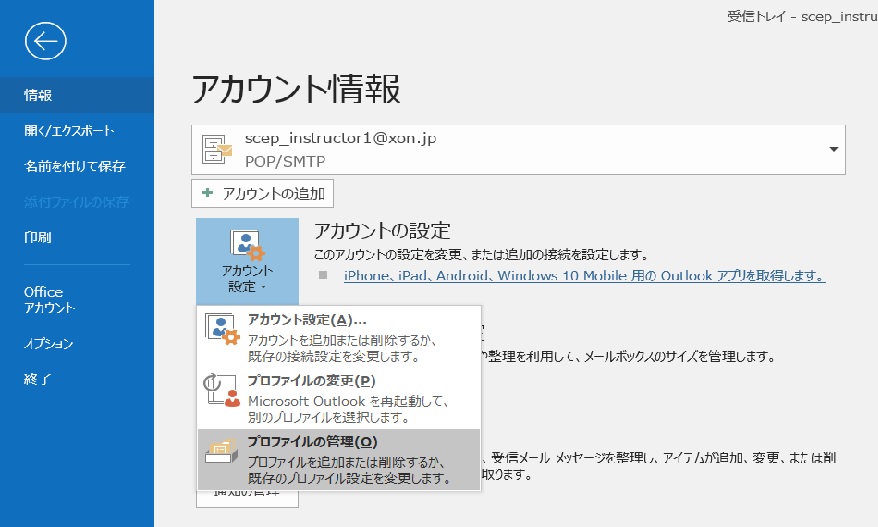 アカウント設定をクリックし、【プロファイルの管理(O)】を選択する。