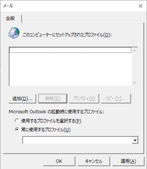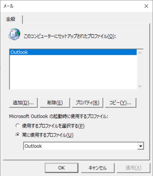 プロファイル名に「Outlook」と入力し、【OK】ボタンをクリックする。