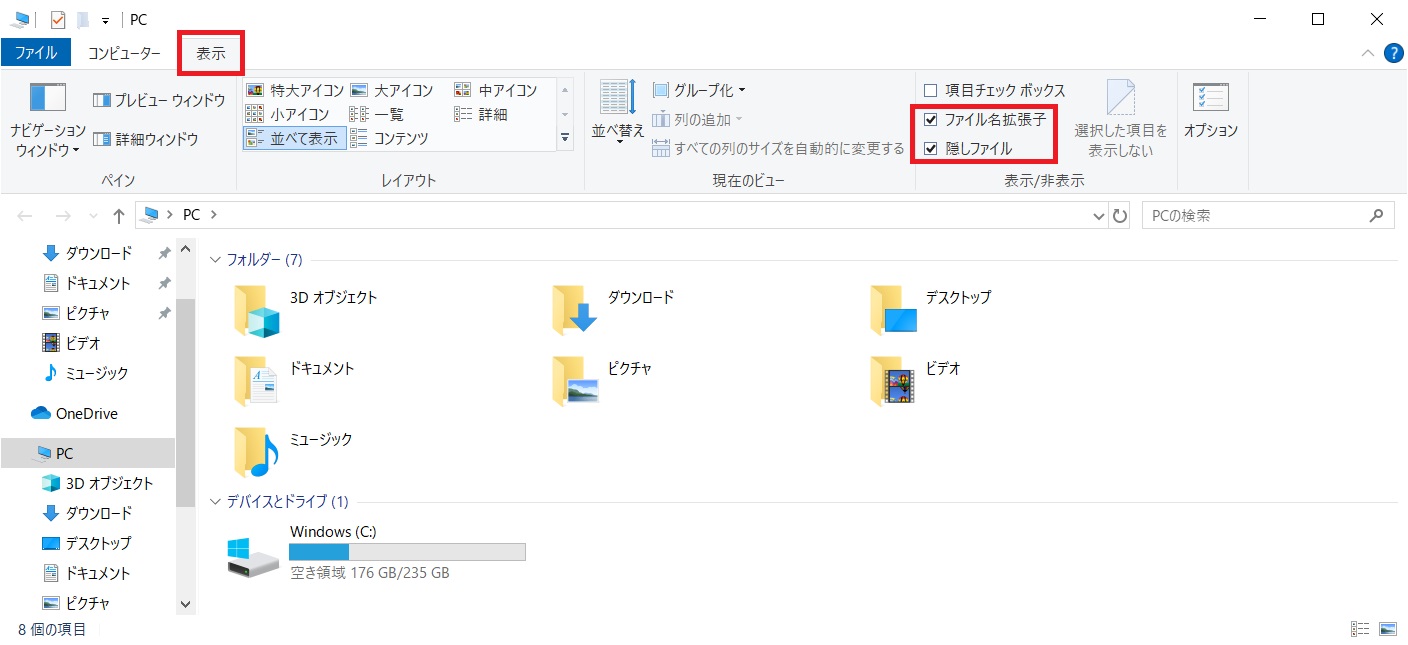 - [ファイル名拡張子]左横の □ にチェックがついていることを確認する。